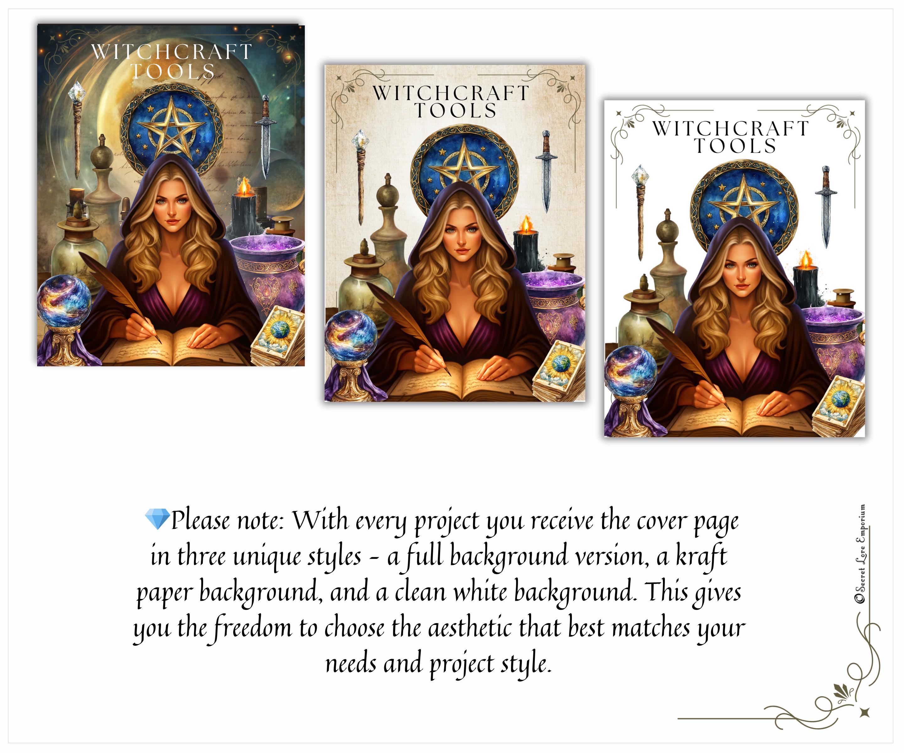 Witchcraft Grimoire PDF | 52 A4 pages with tools, spells, and rituals | 3 cover styles: watercolor, kraft, and white | Printable Book of Shadows insert for witches | Includes athame, chalice, wand, pentacle, and more | Instant download