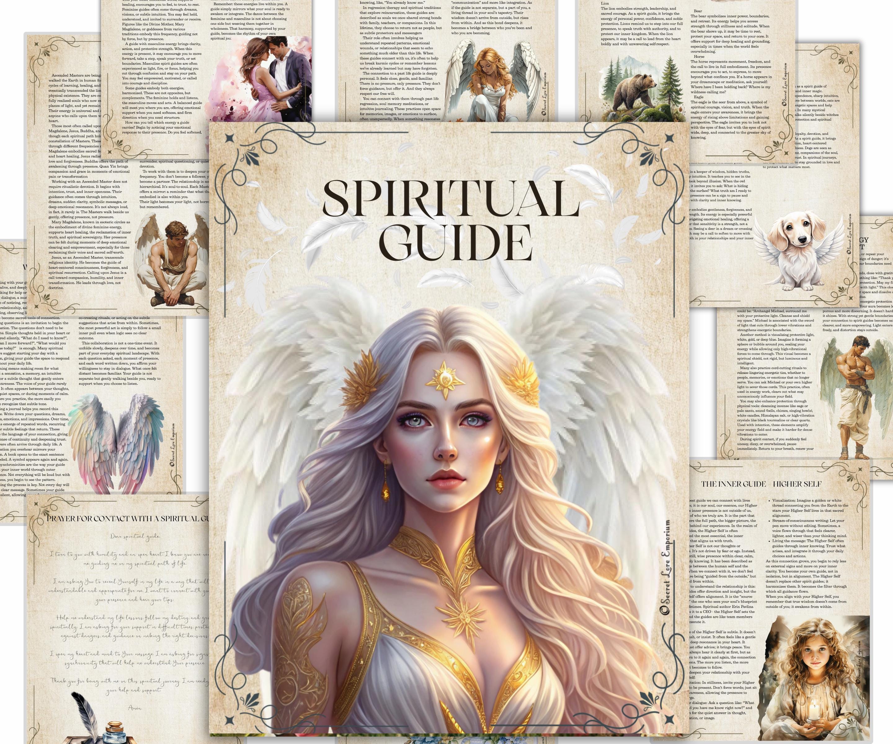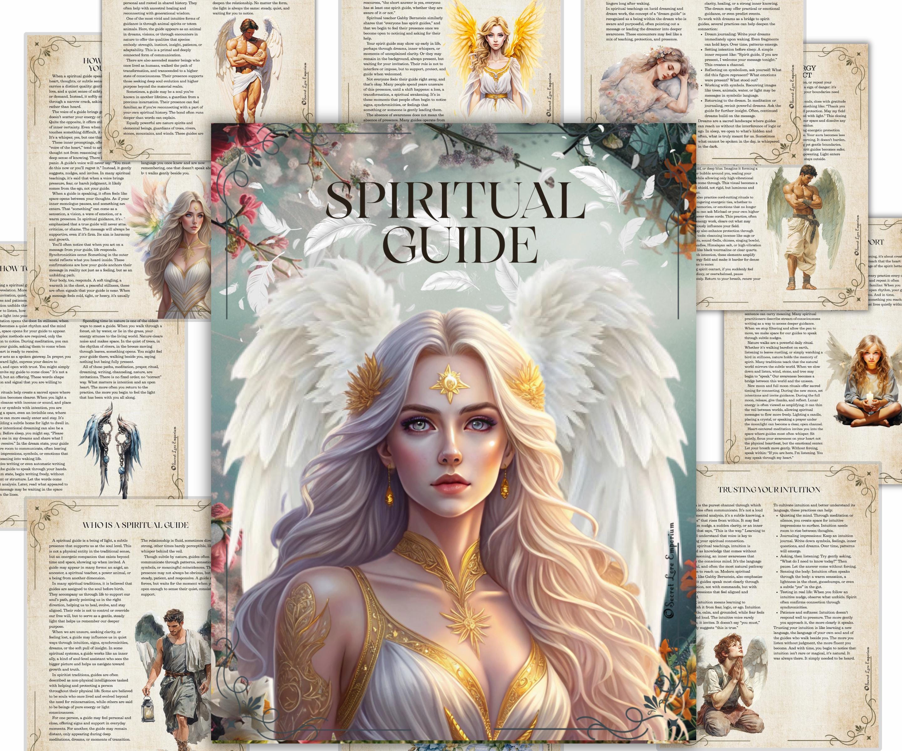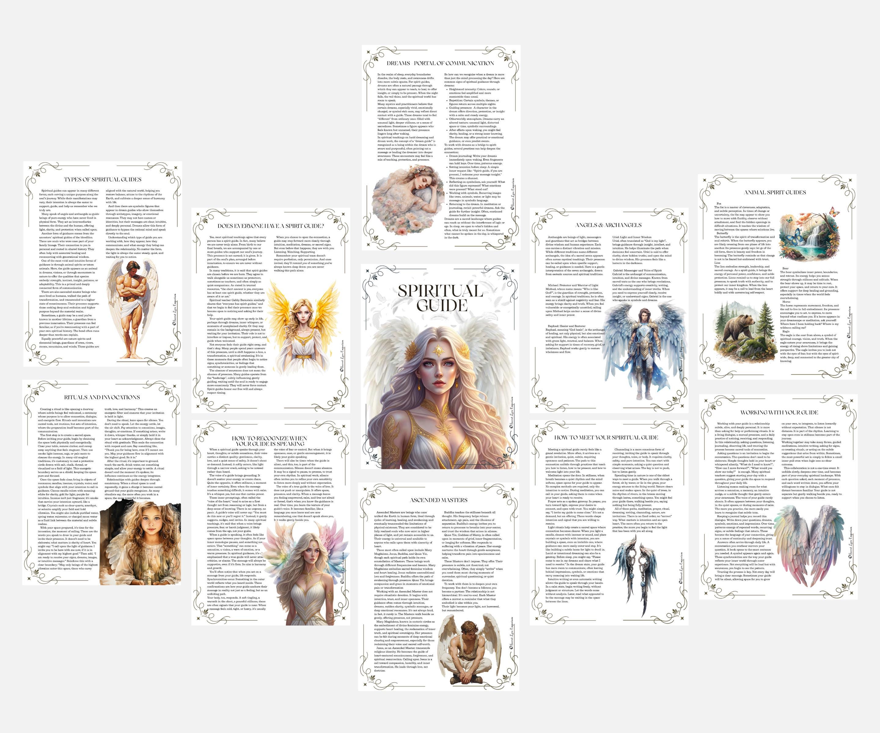 Spiritual Guide Grimoire Pages – a magical 24-page printable PDF set for witches, mystics, and soul seekers. Includes spirit guides, angelic guardians, animal totems, intuition, rituals, and more. Two background versions: white & kraft.