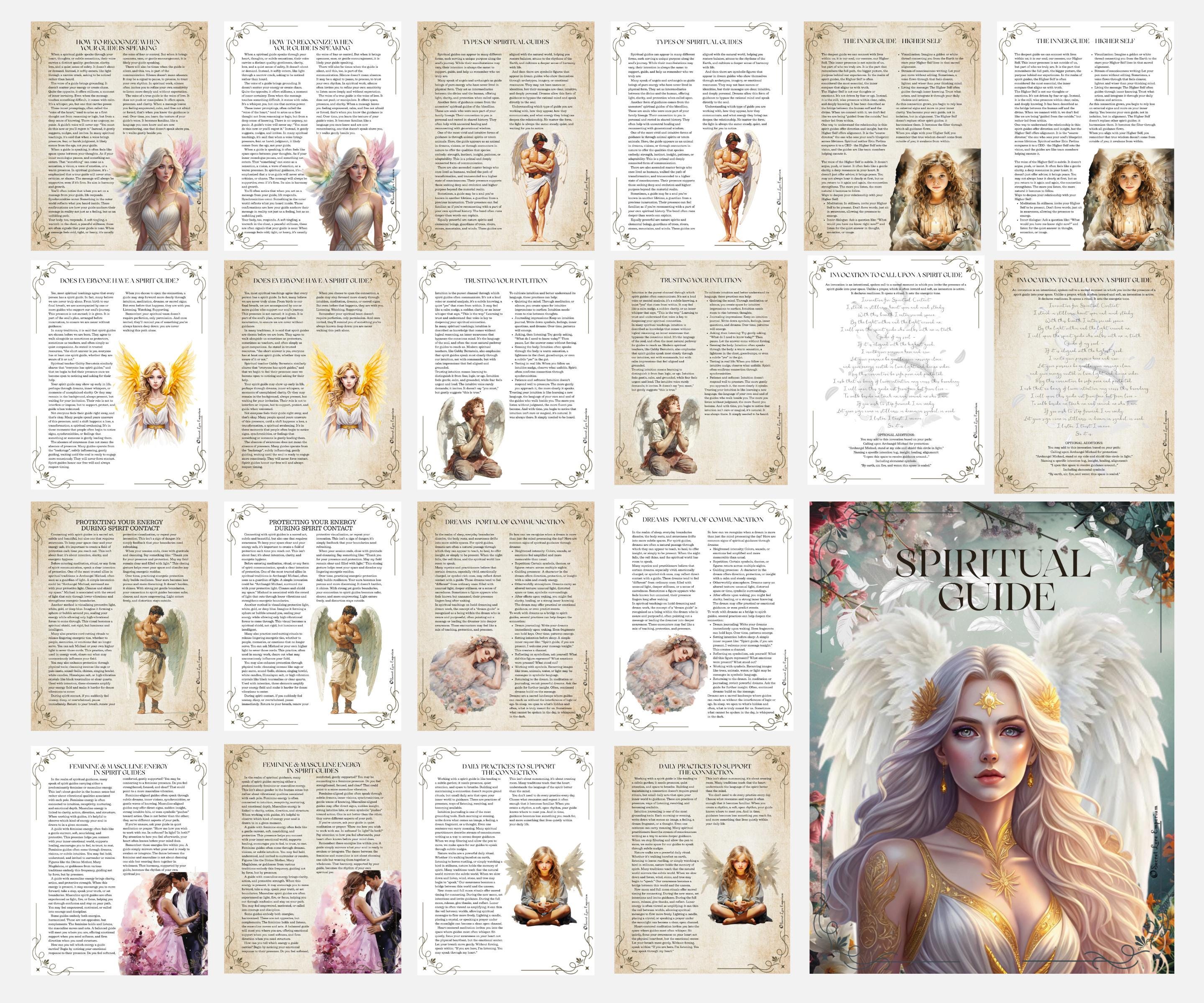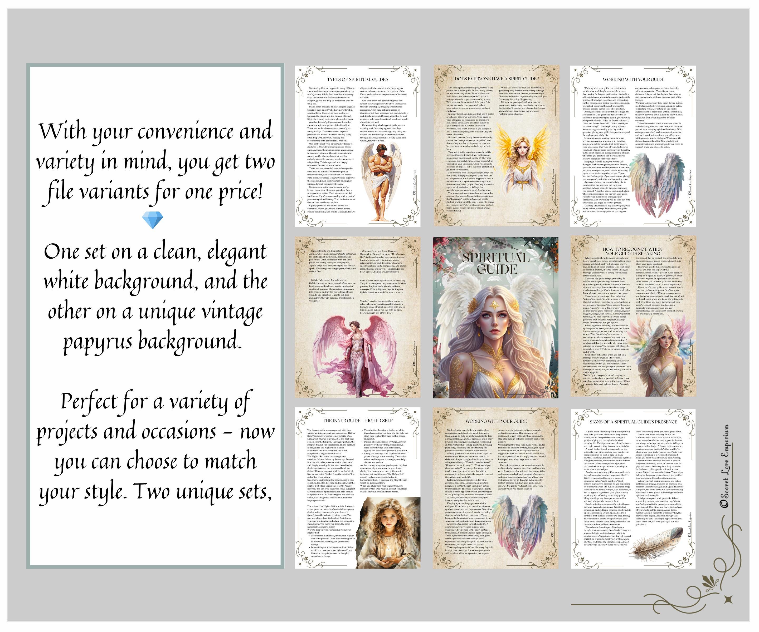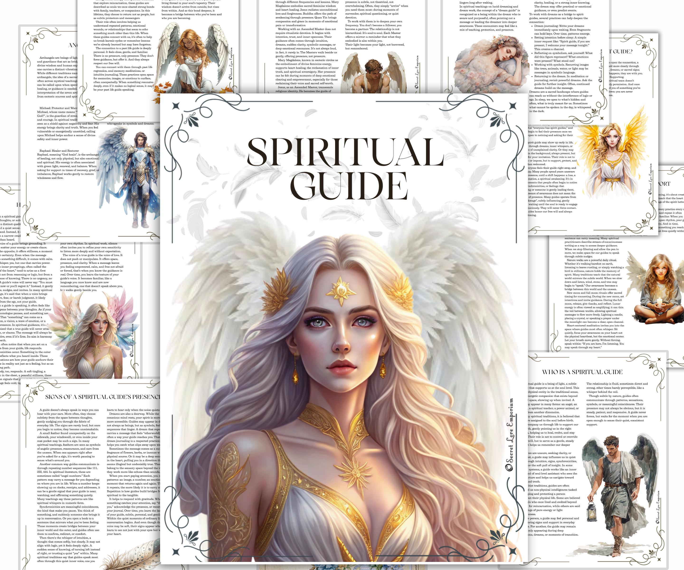 Spiritual Guide Grimoire Pages – a magical 24-page printable PDF set for witches, mystics, and soul seekers. Includes spirit guides, angelic guardians, animal totems, intuition, rituals, and more. Two background versions: white & kraft.