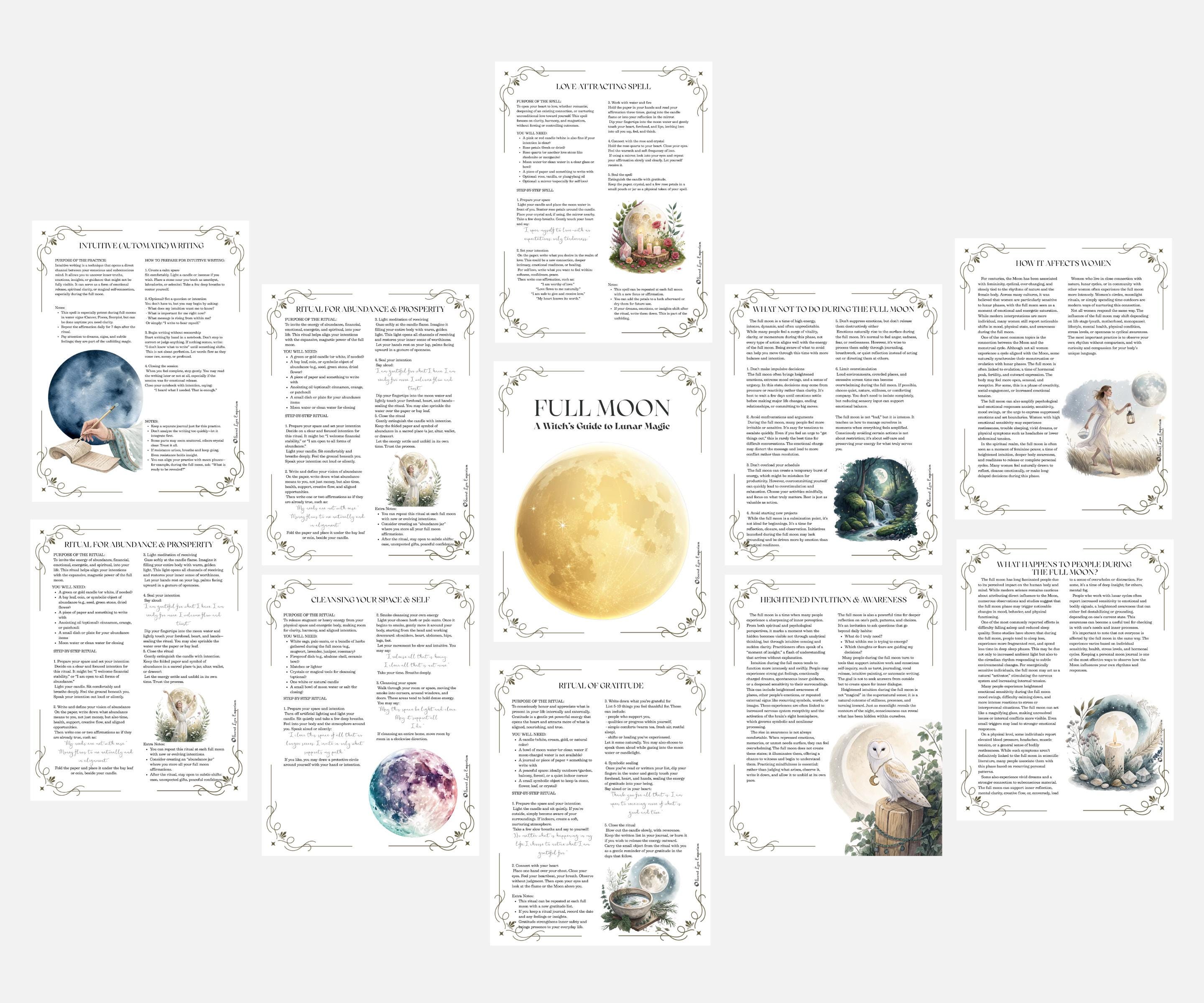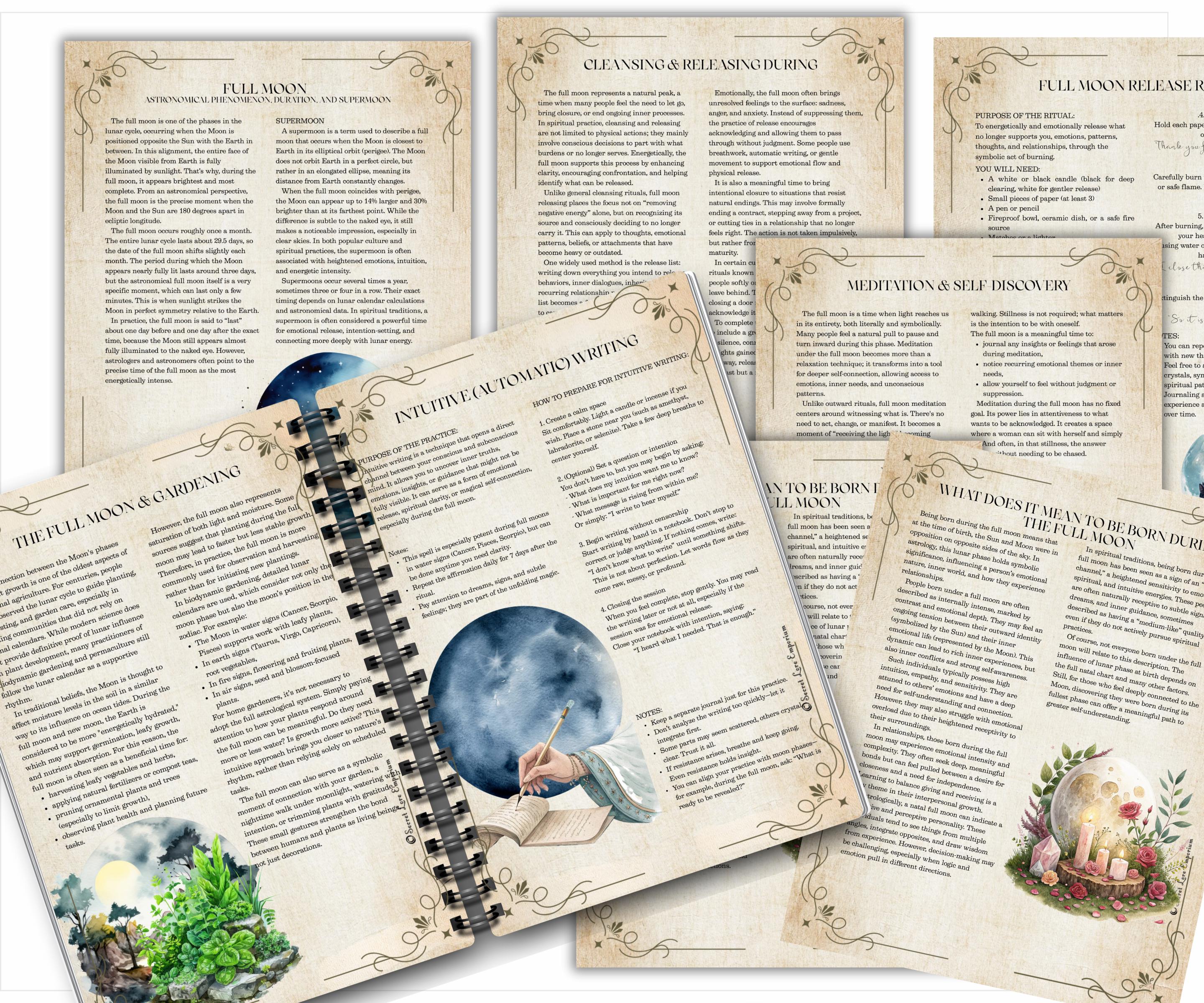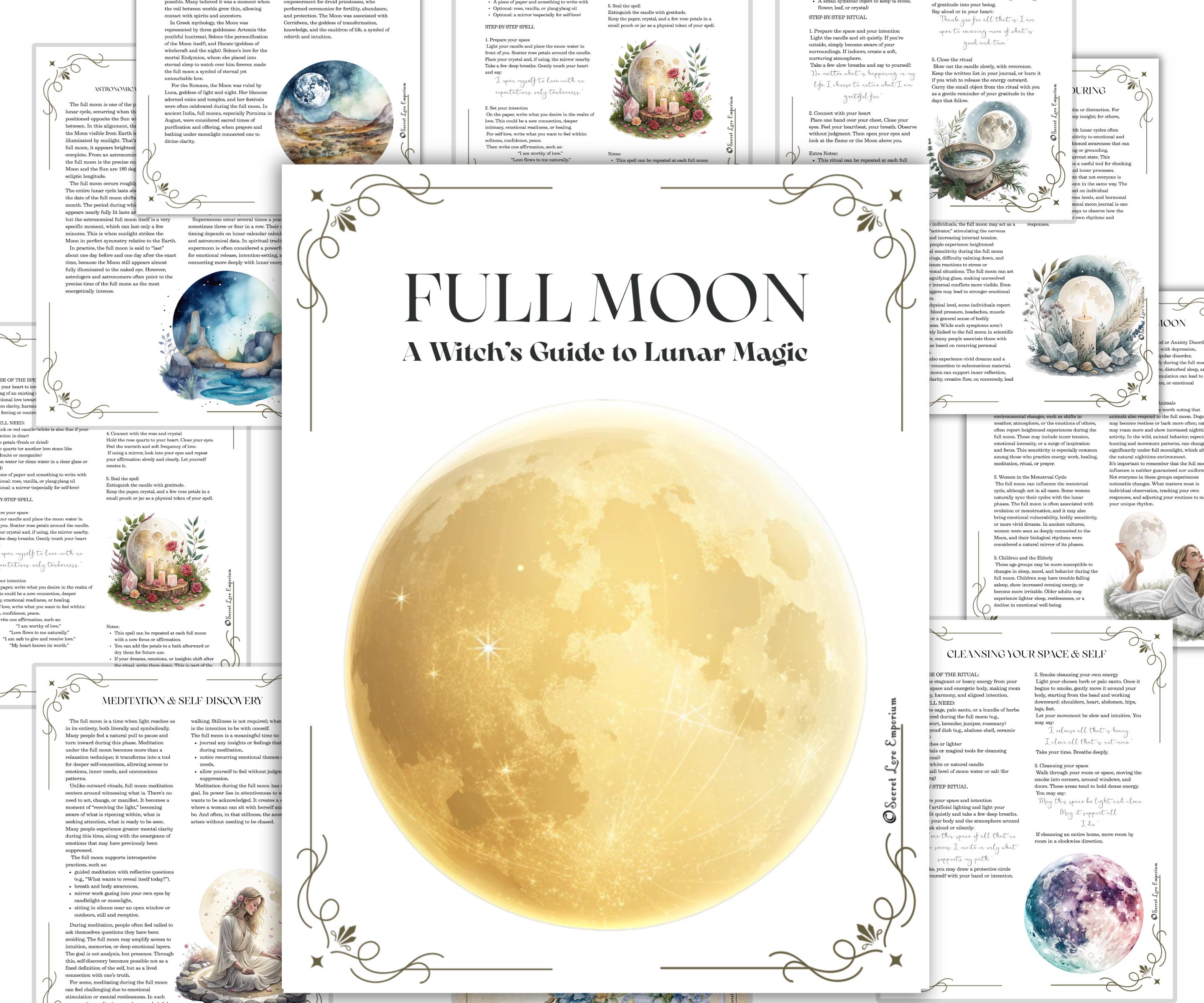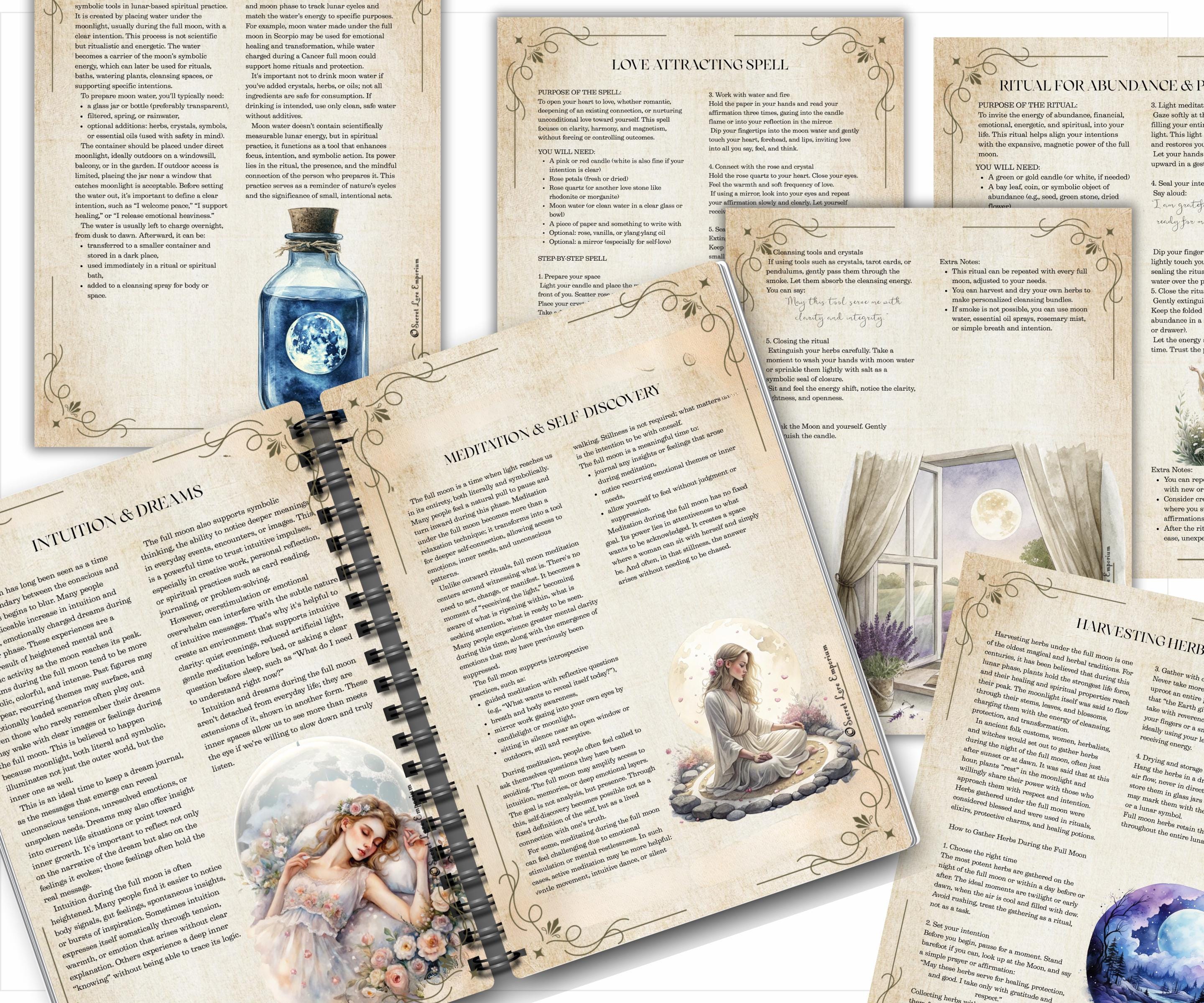 Inside, you’ll find everything you need for your moonlit practice: full moon rituals, cleansing and manifestation spells, moon water recipes, herbal correspondences, shadow work, meditations, and intuitive journaling prompts – all presented with balance, depth, and beauty.