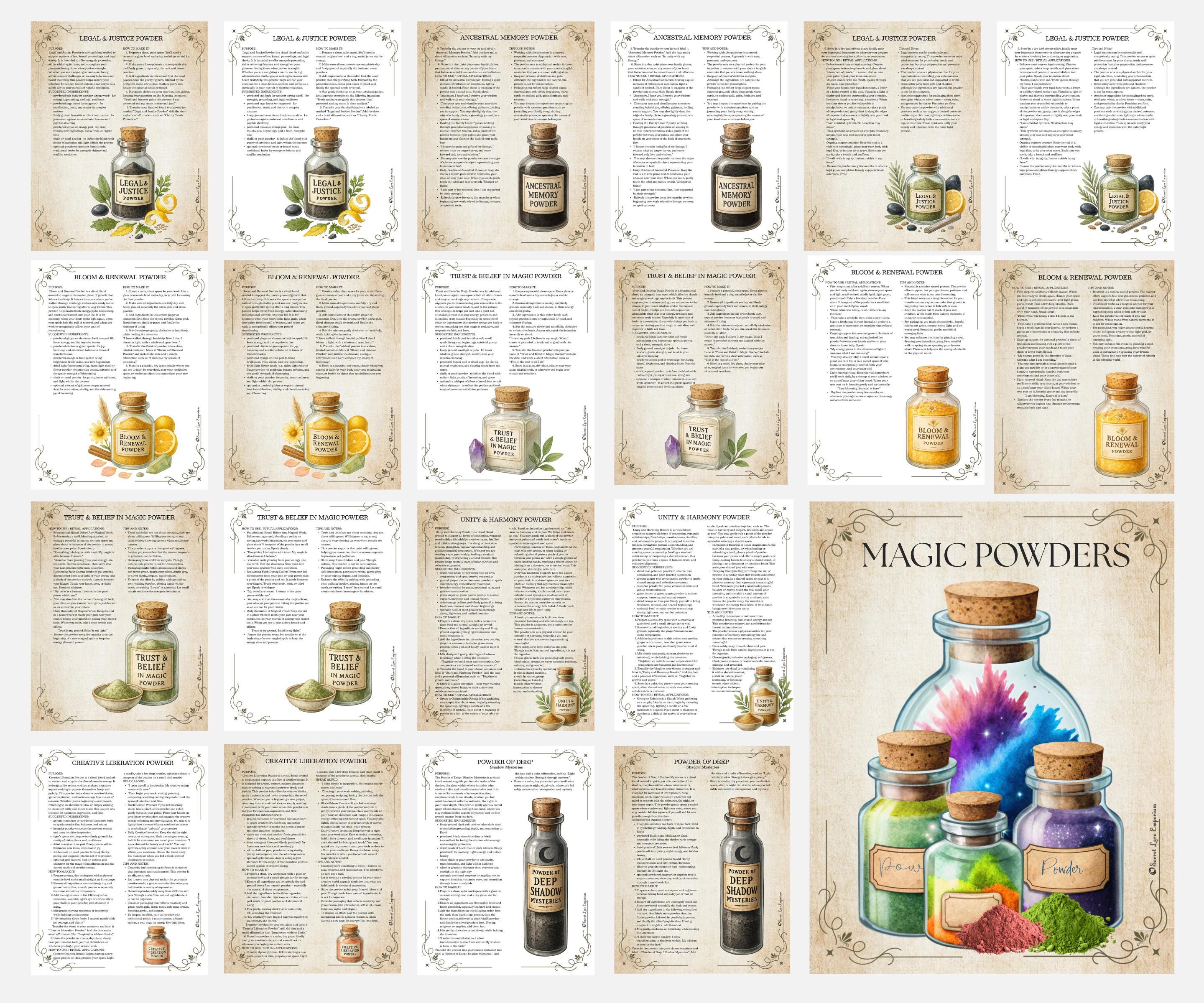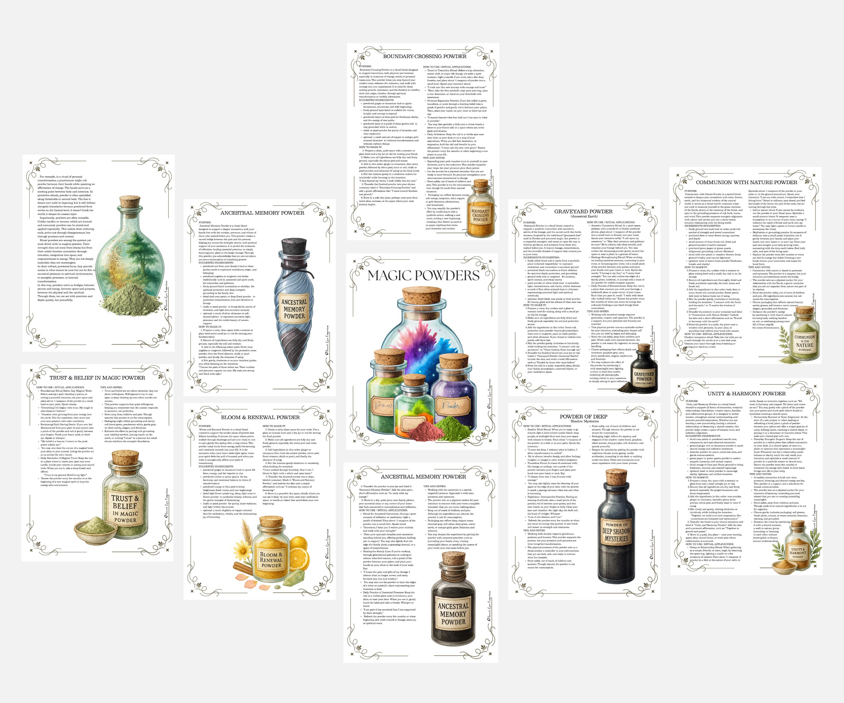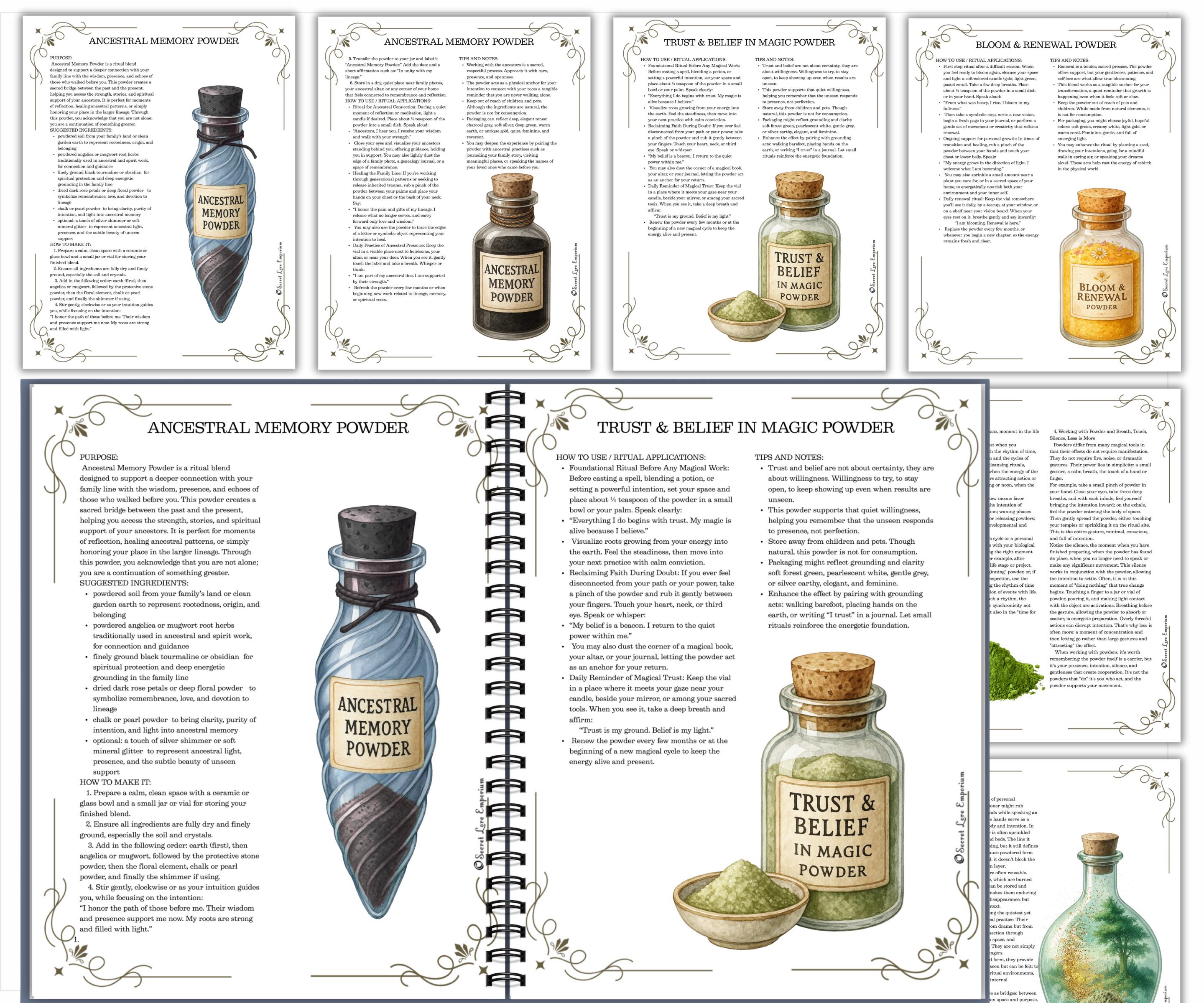 Printable PDF grimoire with 44 A4 pages of magical powders, spell recipes, ritual blends, and witchcraft correspondences. Includes color and kraft paper versions. Instant download, DIY Book of Shadows. No physical item. For personal use only.