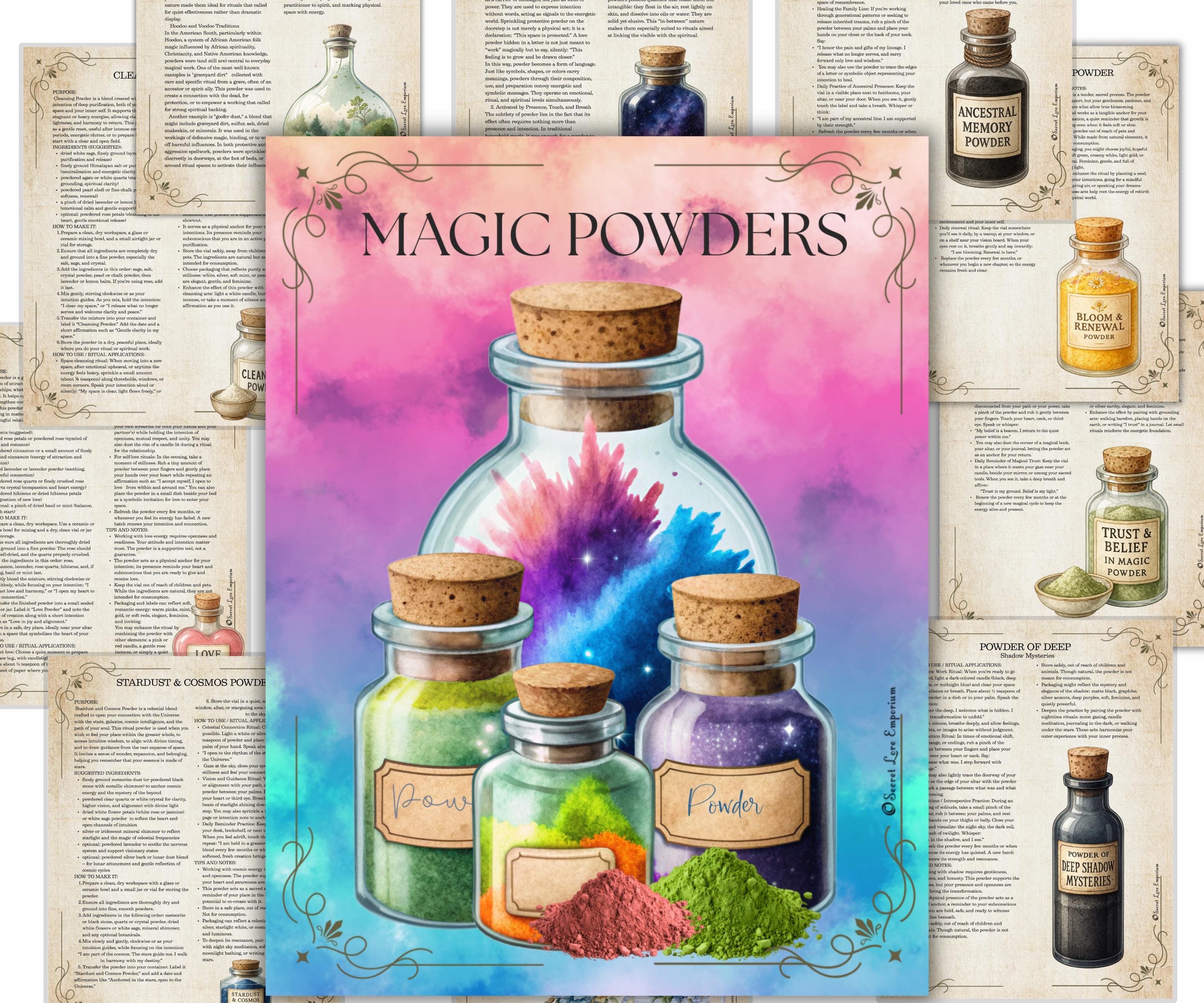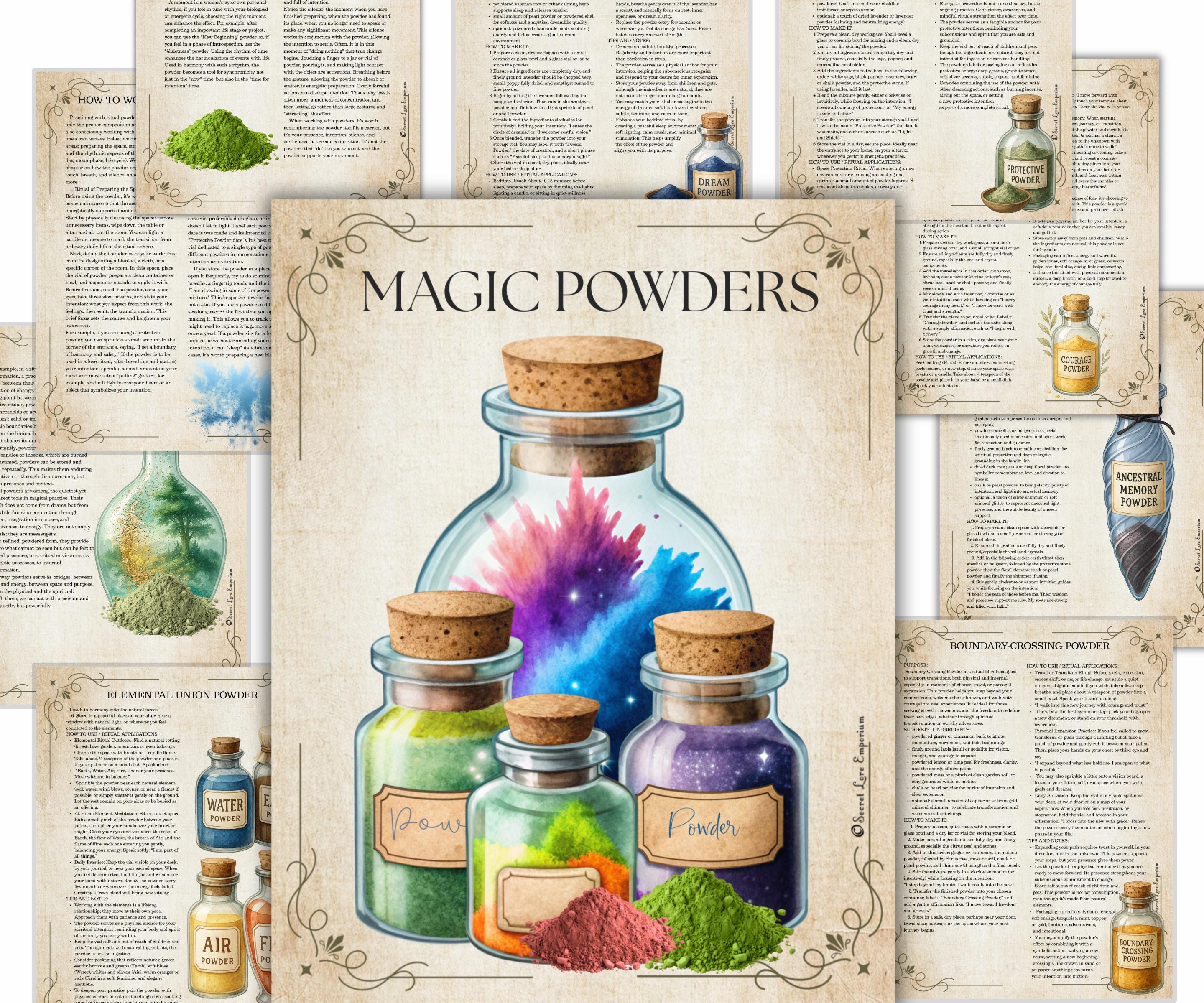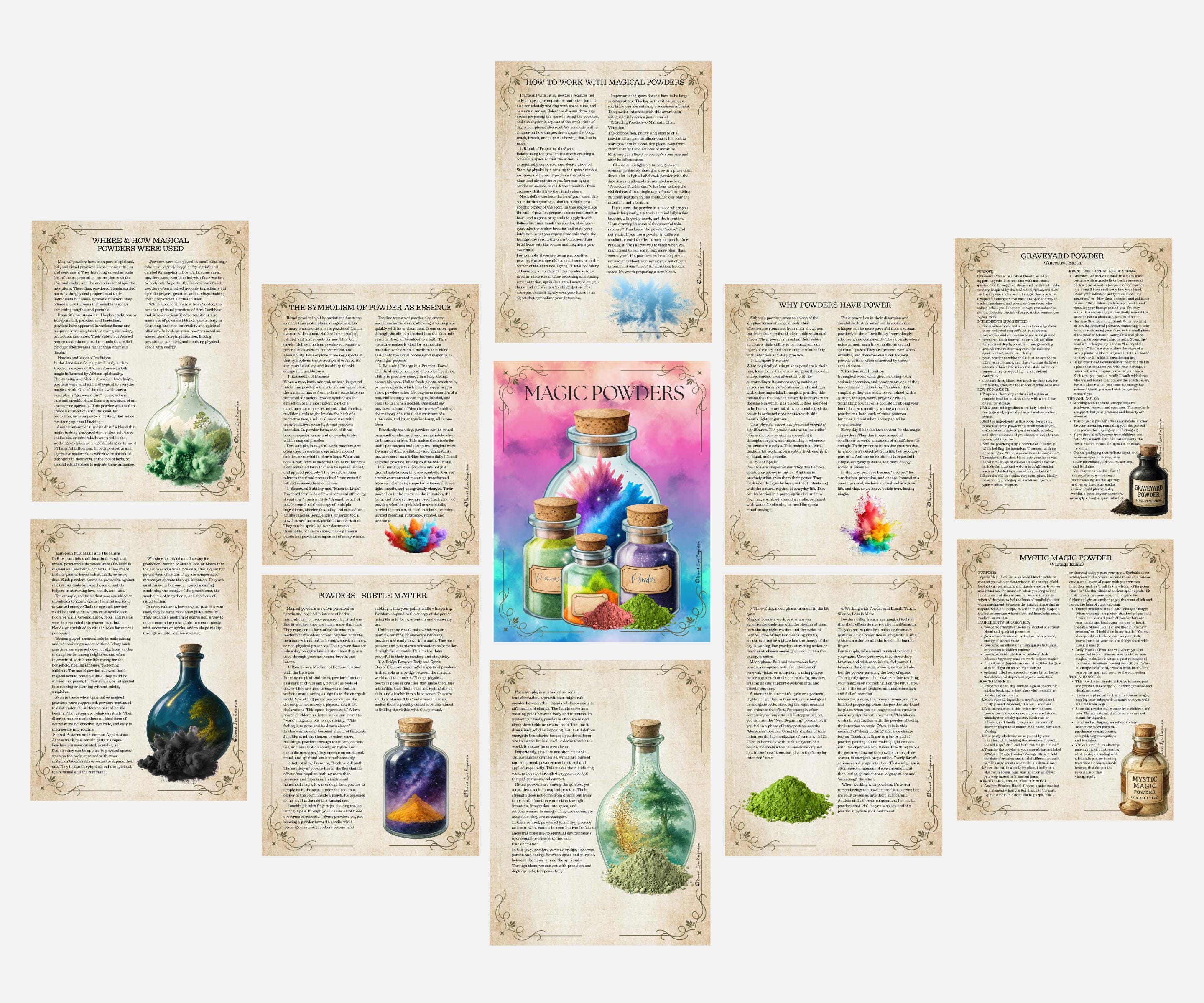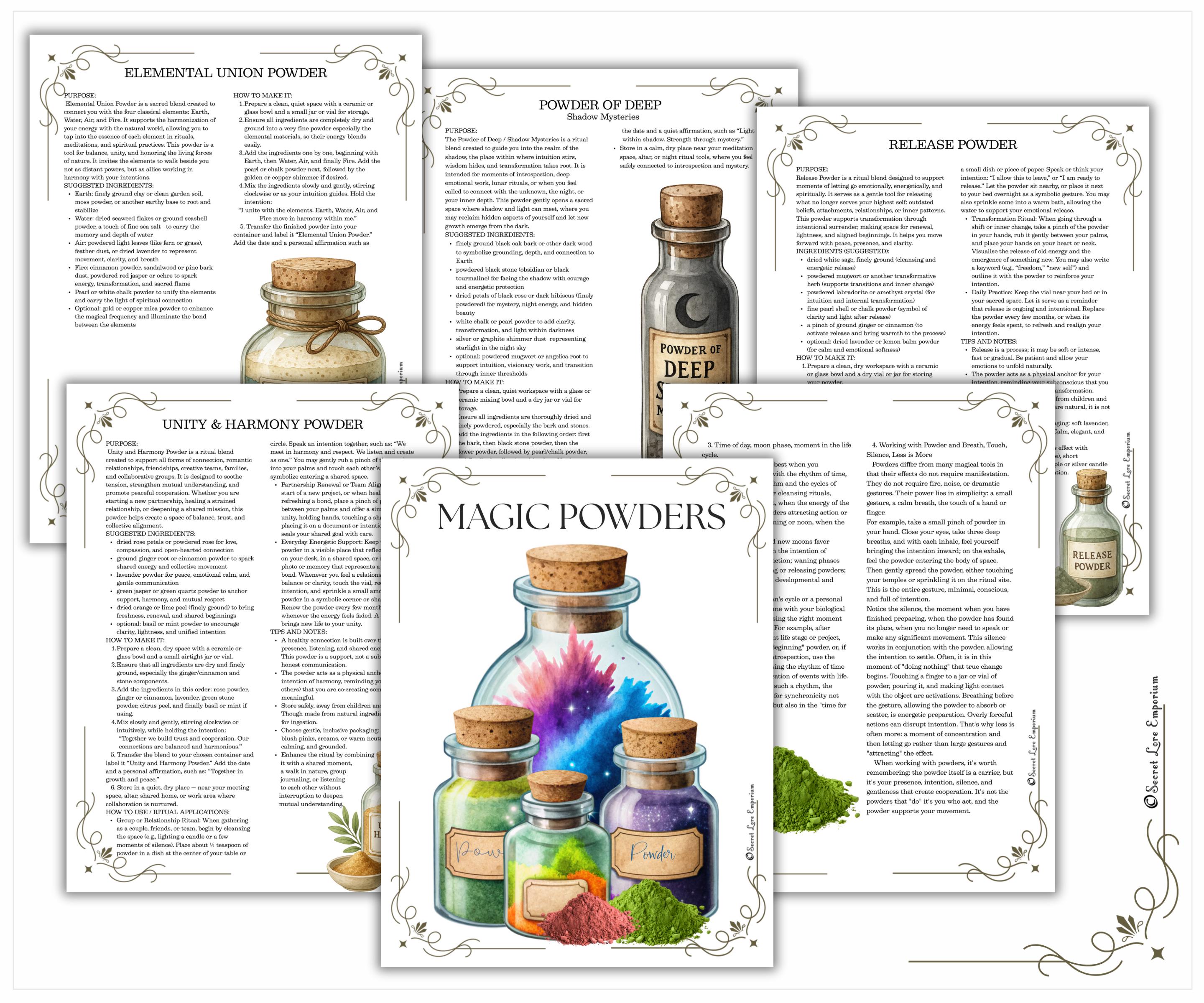 Printable PDF grimoire with 44 A4 pages of magical powders, spell recipes, ritual blends, and witchcraft correspondences. Includes color and kraft paper versions. Instant download, DIY Book of Shadows. No physical item. For personal use only.