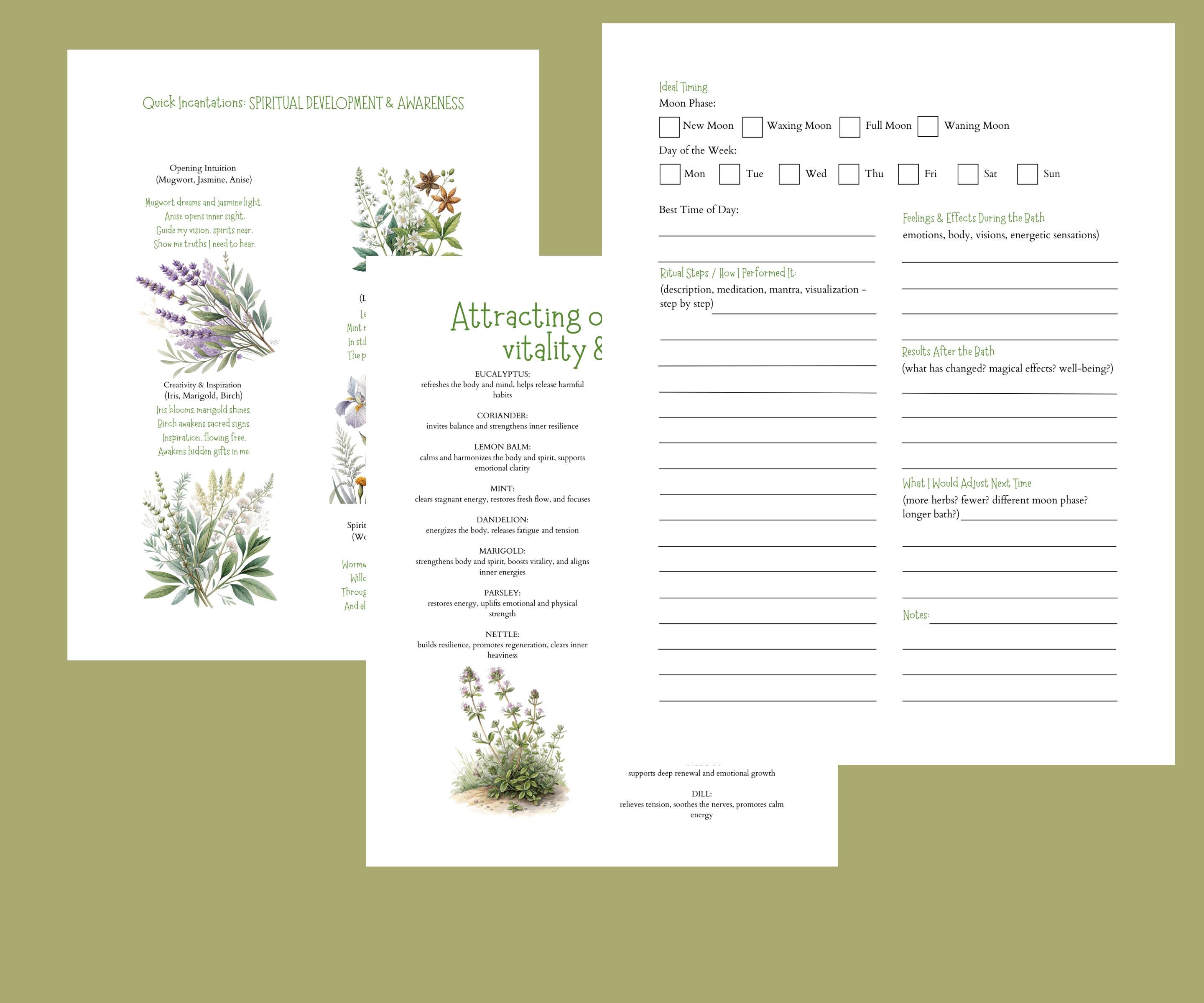a Magical Baths workbook with rituals, sample blends, and recording templates