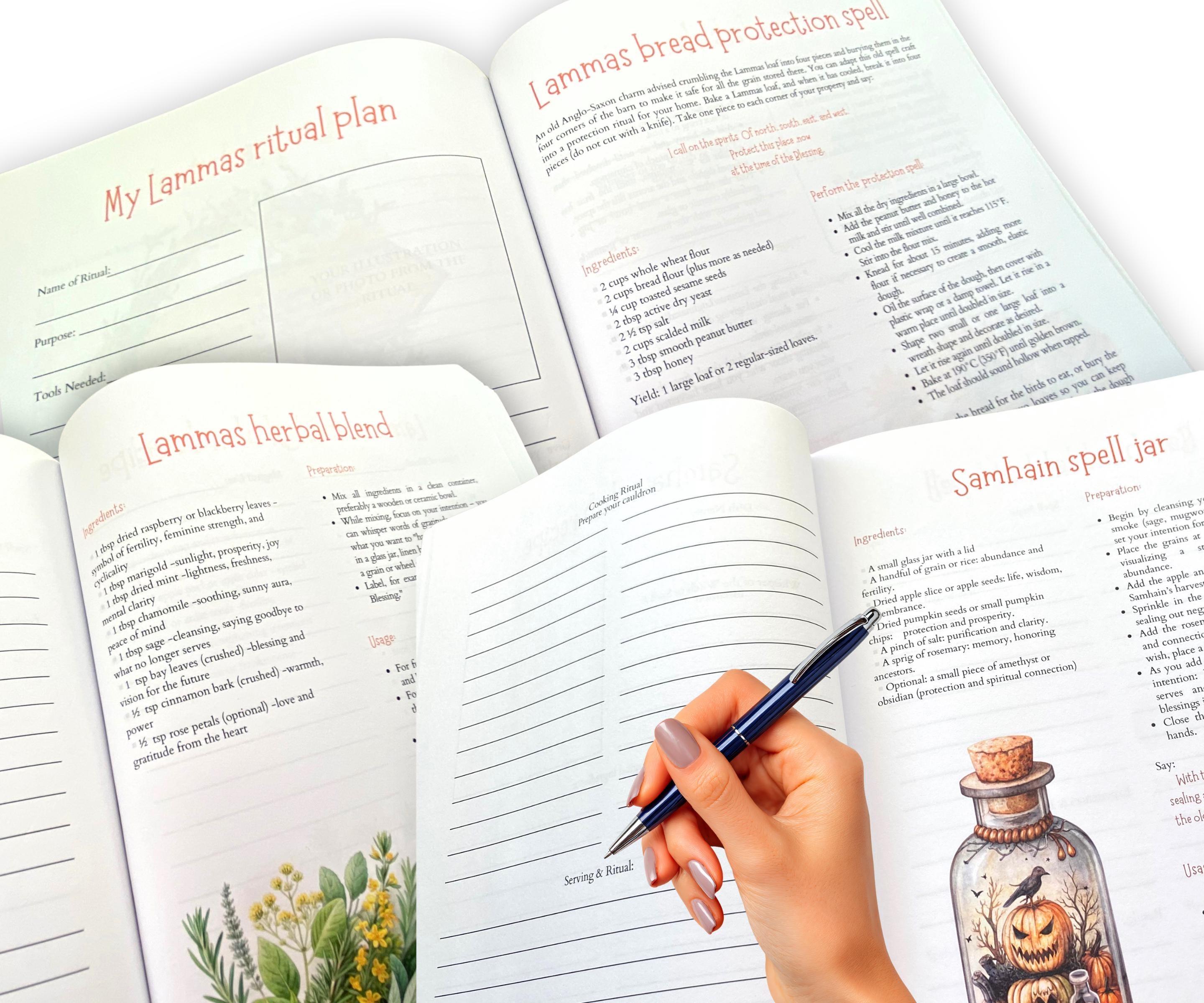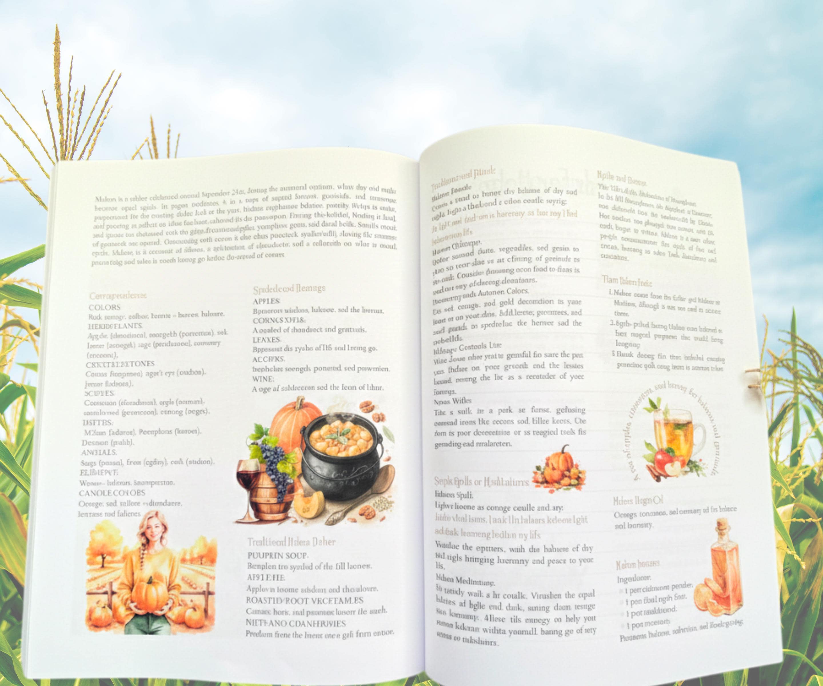 Recipes and Potions: Unique recipes for dishes (e.g., pumpkin and apple soup), elixirs, and herbal blends. Journal Pages: Dedicated pages for recording your intentions, ritual plans, tarot spreads (e.g., the 7-card Samhain spread), and personal magical notes and experiences.